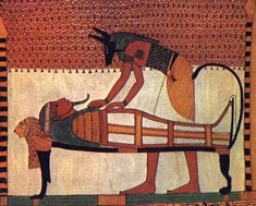 El nombre antiguo de Anubis, «Inpu», significa «el del chacal» Fue primero dios de los muertos y quedó relegado a un segundo plano cuando el culto a Osiris le otorgó a este el papel principal en el Mas Allá. Es uno de los dioses más antiguos del panteón egipcio, apareciendo ya en las paletas predinásticas de Nagada. En un texto de Unas se le asocia al ojo de Horus y, en el Libro de las Cavernas, su cometido era guiar al muerto en el Más Allá, iluminándolo con la luna,   además de presidir las sepulturas; una de sus funciones era la de ser el «abridor de caminos» del Norte